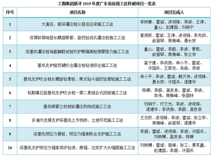 2019年12月12日,2019年度廣東省工程建設(shè)省級工法名單出爐,工勘集團(tuán)共10項科技研發(fā)項目榜上有名。本年度省級工法由廣東省住房和城鄉(xiāng)建設(shè)廳組織專家評審,共受理申報項目1400項,其中696項通過審定并予以公布。